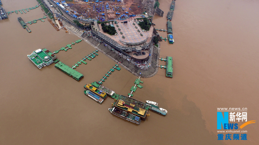 7月1日,今年長(zhǎng)江、嘉陵江最大洪峰過(guò)境后的重慶朝天門(mén)碼頭。 本組圖片由新華網(wǎng)新聞無(wú)人機(jī)隊(duì)拍攝