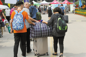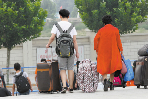 拎箱背包送孩子 大學里的風景線