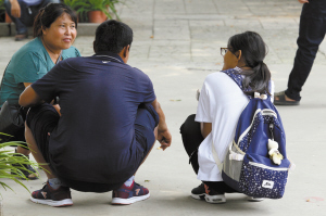 ■家長蹲著囑咐孩子。7vP安康新聞網