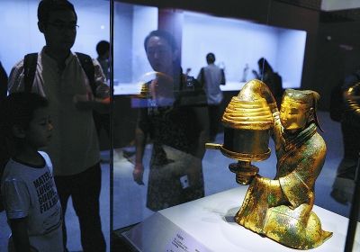 1000平方米的展廳里, “皇后之璽”玉印、長信宮燈、兵馬俑、金縷玉衣、紙地圖、“滇王之印”金印、青銅方斗、“中國大寧”鎏金青銅鏡、“西王母”陶座青銅搖錢樹、海昏侯馬蹄金等均已就位,其中“國寶級”展品約占45%。它們分散在序廳、文治武功、長樂未央、事死如生、多元文化、絲路交通及尾聲七個部分,娓娓講述400年秦漢往事,重現(xiàn)中國王朝歷史上的第一個盛世。