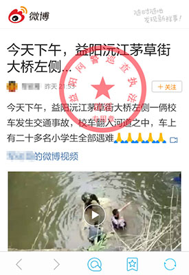 【傳聞】9月7日,一名為“軍砣哥”的網(wǎng)民在微博發(fā)帖稱,“今天下午,益陽茅草街左側(cè)一輛校車發(fā)生交通事故,校車翻入河道之中,車上有二十多名小學生全部遇難”,并附上現(xiàn)場車輛墜河視頻,該消息很快被部分網(wǎng)民轉(zhuǎn)發(fā)。
