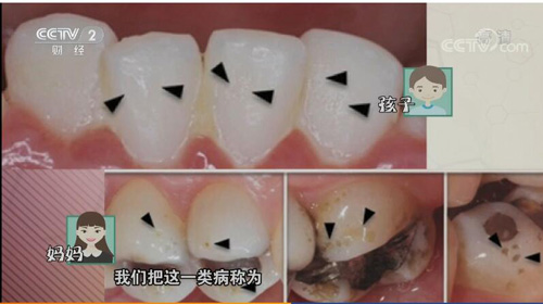 段小紅說:“這個病例的整個牙齒顏色接近正常,但細微觀察,牙齒表面黑色三角指的地方出現一些小的、點窩樣的缺損,這是不正常的,這是孩子的媽媽的情況,從這兩張照片可以看到,小孩牙釉質出現的異常是由媽媽這一輩遺傳給他的,我們把這類病稱為遺傳性的釉質發育不全。”