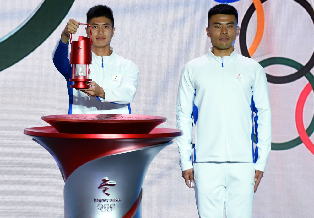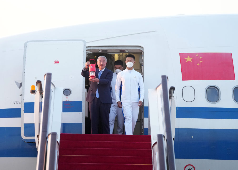 ⬆️北京冬奧組委特別代表、北京冬奧組委副主席于再清(左)手持火種燈走出艙門。ban安康新聞網