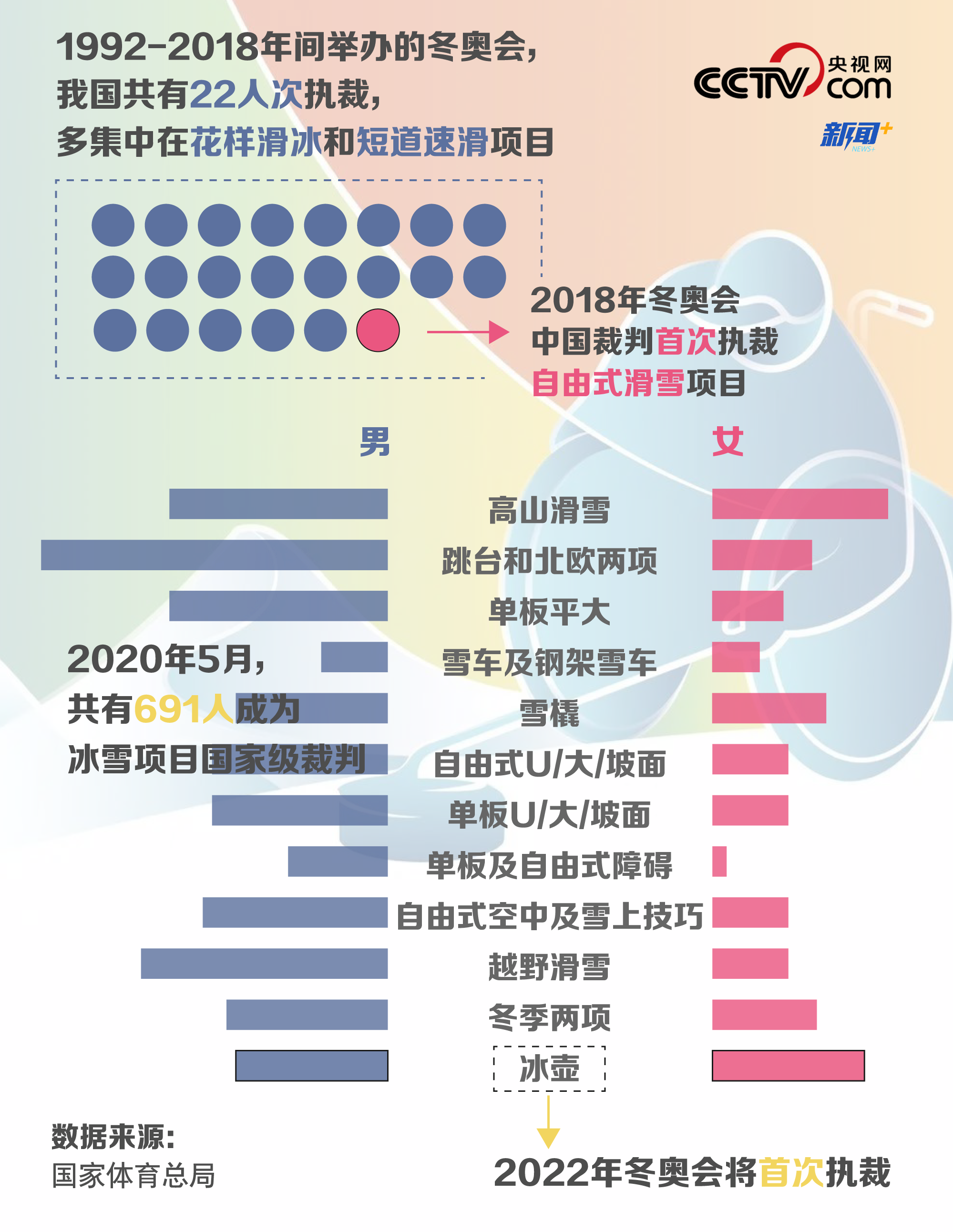 除了選手們在賽場上大放異彩,冬奧會賽場上的裁判席也開始出現“中國身影”。據統計,1992-2018年的冬奧會中,我國共有22人次擔任裁判,2018年的冬奧賽場上出現首位自由式滑雪空中技巧項目的中國裁判。為更好地做好冰雪項目競賽工作,體育總局冬運中心于2020年5月授予691人冰雪項目國家級裁判員稱號,其中多為雪上項目裁判員。值得一提的是,2022年冬奧會將有4名中國冰壺裁判首次執裁。