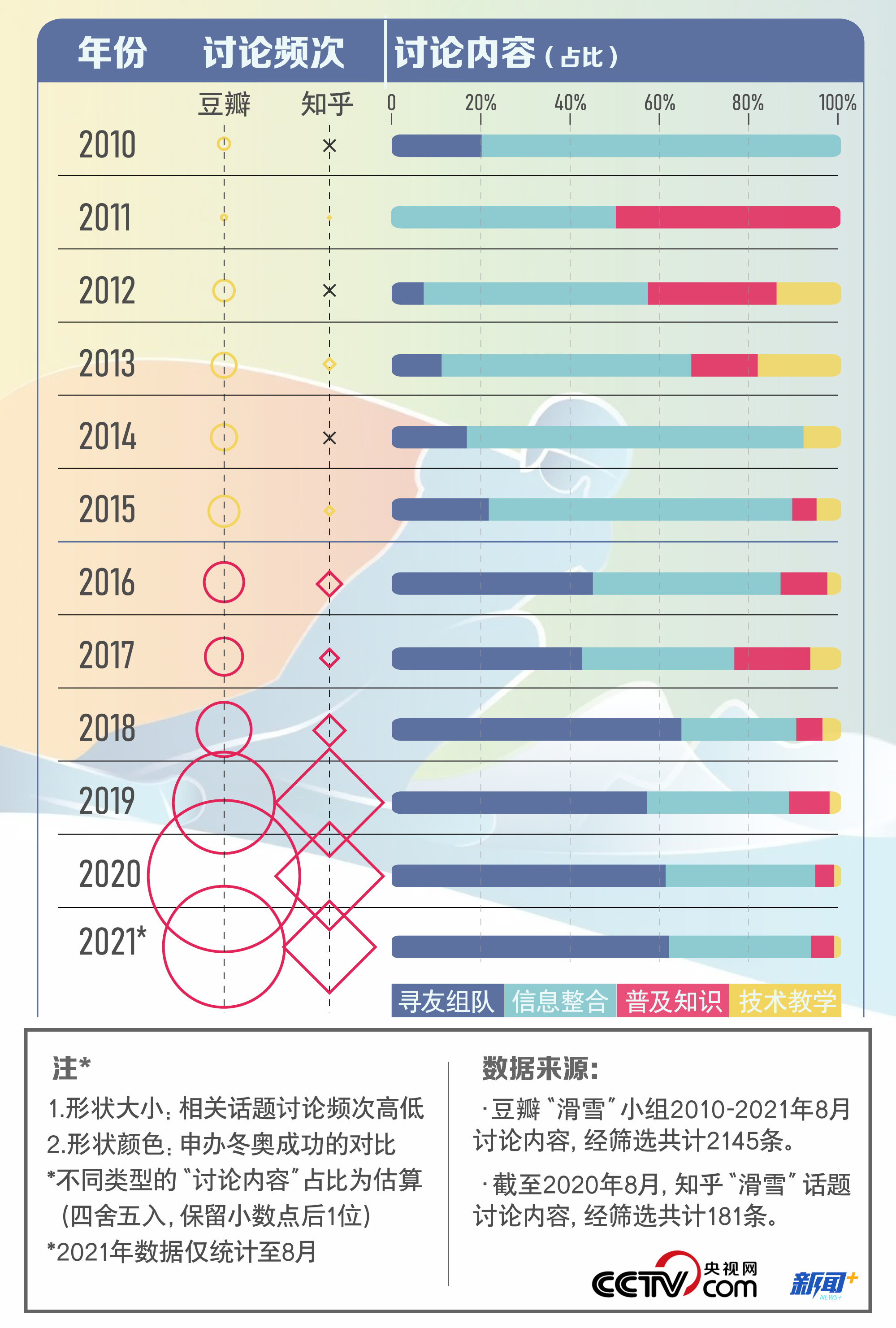 此外,人們對冰雪運動關注和討論的內容也悄然改變。統計發現,隨著中國互聯網的發展,2016年開始,“滑雪”在網絡平臺的討論頻次較前五年相比明顯增加,“尋友組隊”成為大部分愛好者的第一需求,而且討論的內容也更為豐富多元,側面反映了滑雪項目正逐漸脫離“小眾”,走向“大眾”。
