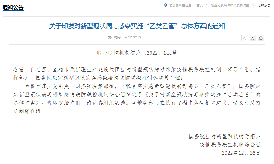 關于印發對新型冠狀病毒感染實施“乙類乙管”總體方案的通知MAR安康新聞網