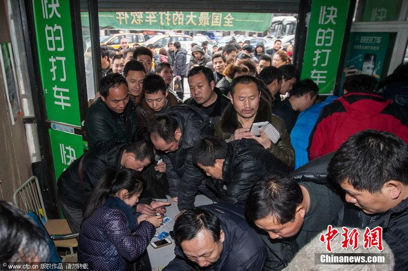 2014年2月19日,杭州“快的打車”服務點,出租車司機們排隊安裝軟件。圖片來源:CFP視覺中國5kE安康新聞網