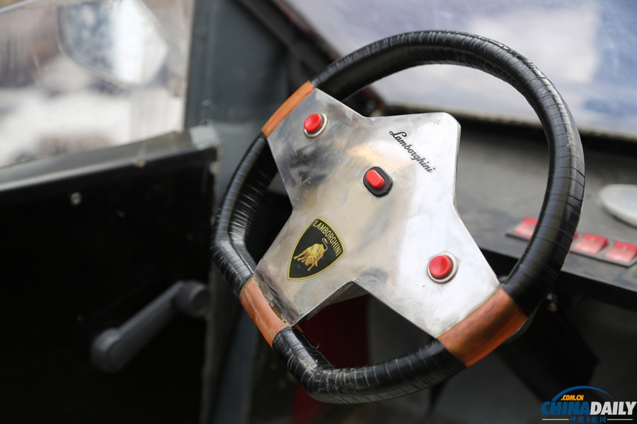 方向盤中部按鈕控制車子的前進、倒車。方向盤上的蘭博基尼標志是老郭在網上購買的。(侯建勛 攝)