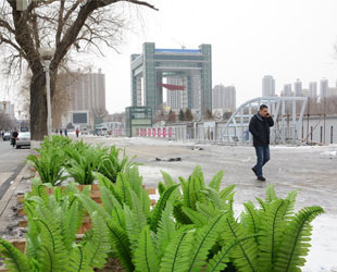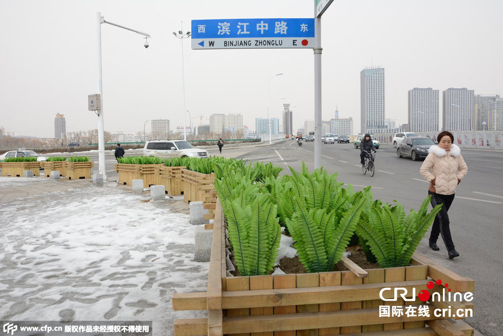 2015年3月15日,吉林省吉林市,在吉林市吉林大街上,市民從形似“油麥菜”的綠色塑料假花前行走。圖片來源:王凱冬近日,市民發現位于吉林市吉林大街與濱江中路……