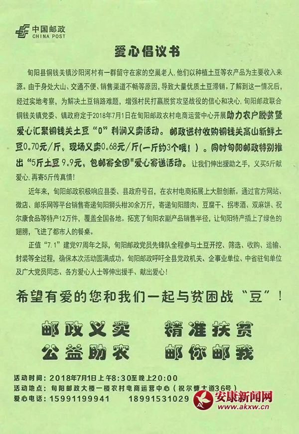進村高價回收、線下低價義賣:旬陽郵政公司已經與銅錢關鎮黨委、鎮政府對接聯合,赴沙陽河村收購高山新鮮土豆0.70元/斤,現場義賣0.68元/斤。對,你沒有看錯,真正的高價收購,低價義賣,只為貧困戶的勞動有尊嚴。定于2018年7月1日8點30分至晚上8點,在旬陽郵政大樓一樓農村電商運營中心開展“助力農戶脫貧暨愛心匯聚銅錢關土豆義賣活動”。