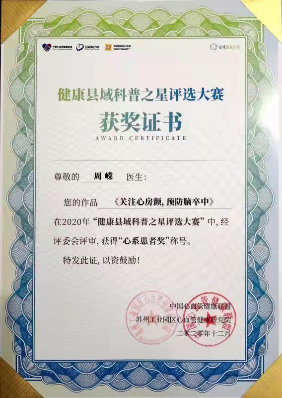 2020年 獲第二屆“互聯網+健康中國”科普大賽“科普達人獎”