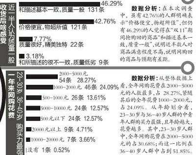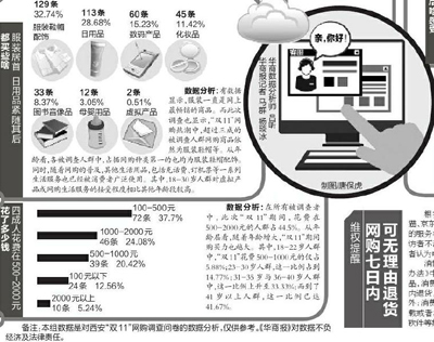 媒體對這些調查數據逐一分析。結果顯示,“雙11”期間,西安網購人群最愛買衣服,花費在500-2000元的人占44.5%。