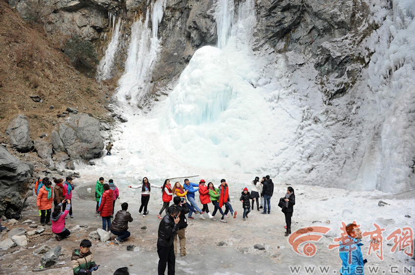 昨日下午2時,游客在戶縣澇峪黑山瀑布前合影留念。不時有冰塊從瀑布上方掉落,著實讓人捏了一把汗 記者 趙彬 攝