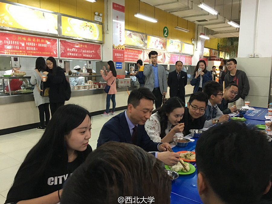 講座開始前,康輝還和同學們共進早餐。他不斷夸贊早上的包子好吃。圖片來自@西北大學