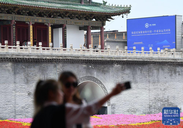 ↑5月16日,游客在西安市北大街上與中國-中亞峰會主題裝置合影。新華社記者 李一博 攝nwC安康新聞網