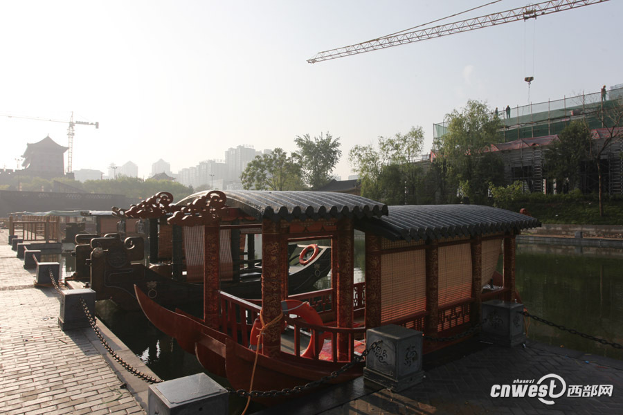 城墻南門西側護城河上停泊著7艘秦、漢、唐不同主題的仿古游船。