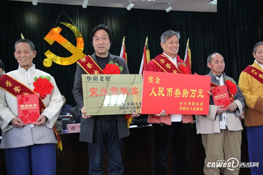 華陰市為“華陰老腔”頒發(fā)突出貢獻(xiàn)獎(jiǎng),為老腔藝人們頒發(fā)了榮譽(yù)證書。西部網(wǎng)訊(通訊員 楊雷雷 孟晟博) “華陰老腔”榮登2016年中央電視臺(tái)春節(jié)聯(lián)歡晚……