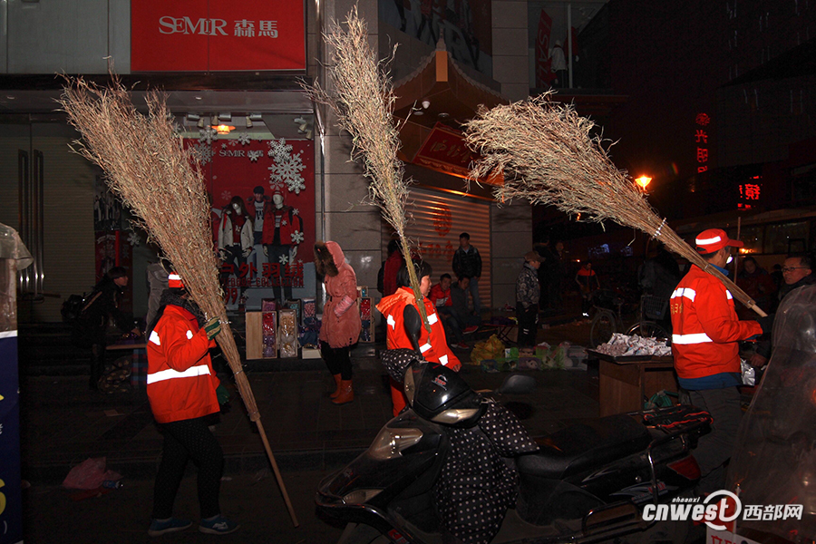 環衛工人連夜出動,徹底掃完或到天亮。西部網訊(記者 趙昊 實習記者 劉望) 平安夜結束以后,稍早前人流密集的鐘樓、東大街、騾馬市步行街等處,地上殘留的垃圾……