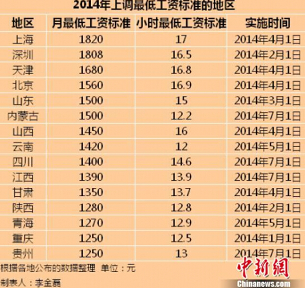 15地公布2014年最低工資標準 陜西1280排倒數第四
