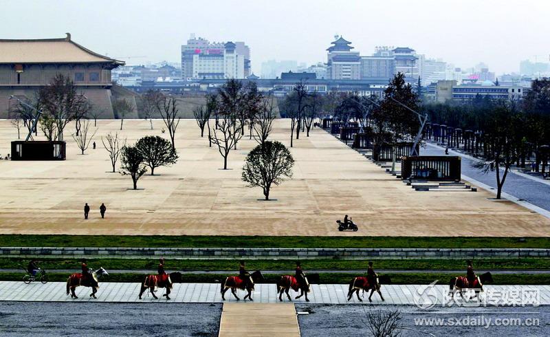 一列馬隊從西安的大明宮遺址公園的含元殿遺址前經過(2011年12月7日攝)。6月22日,中國與吉爾吉斯斯坦、哈薩克斯坦聯合提交的“絲綢之路:長安—天山廊道路……