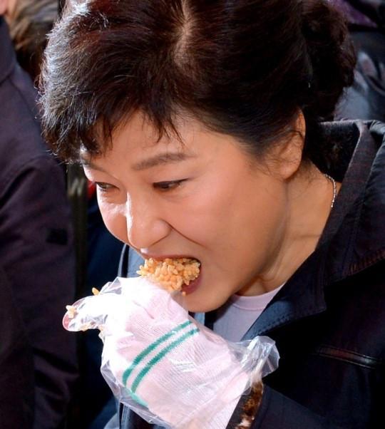 2012年11月,總統候選人樸槿惠現身傳統市場,購買糕點并品嘗。