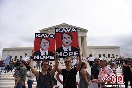 當(dāng)?shù)貢r間10月6日,美國民眾在華盛頓的最高法院門前集會,反對卡瓦諾擔(dān)任最高法院大法官。當(dāng)天,美國參議院最終投票確認(rèn)卡瓦諾出任聯(lián)邦最高法院大法官。 中新社記者 鄧敏 攝