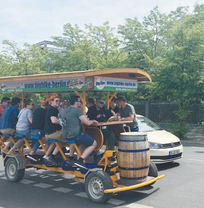 在德國(guó)柏林,多人單車很受游客歡迎。