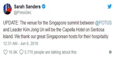 人民網(wǎng)北京6月6日電(姚麗娟) 美國(guó)總統(tǒng)特朗普與朝鮮最高領(lǐng)導(dǎo)人金正恩的首次會(huì)面將于6月12日在新加坡舉行。美國(guó)白宮5日公布了美朝領(lǐng)導(dǎo)人會(huì)晤的……