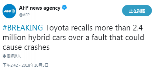【環球網報道 記者 崔舒飛 張飛揚】據法新社5日最新消息,因發現存在可導致車禍的錯誤,豐田汽車公司召回超過240萬輛混合動力車。 據路透社報道,此次召回包括……