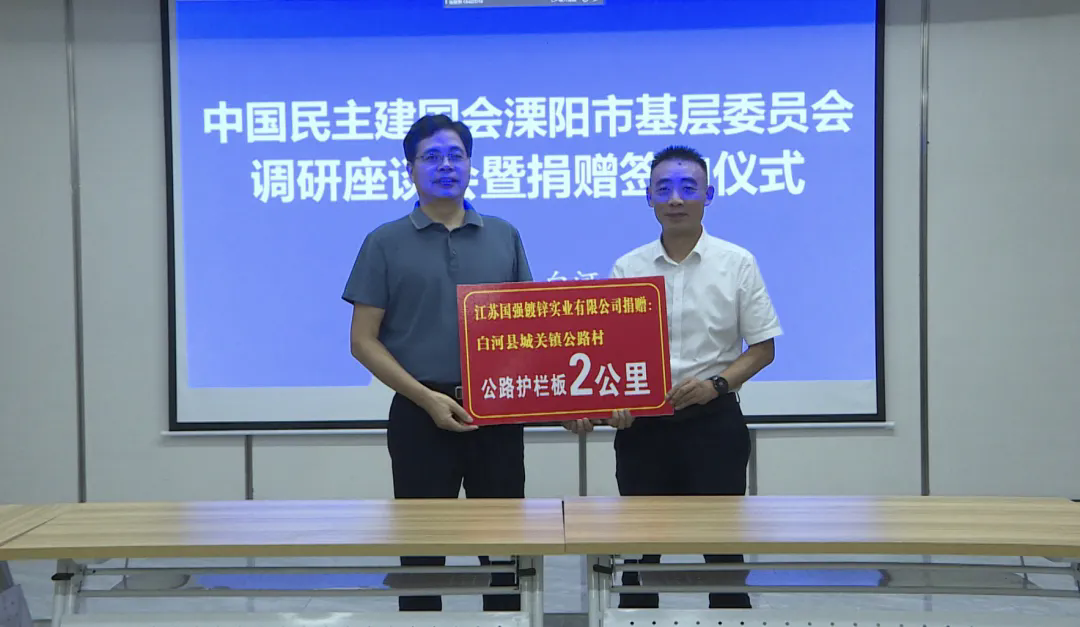 在座談會上,民建溧陽基層委員會向白河慈善協會捐贈5萬元幫扶資金,會員企業江蘇國強鍍鋅實業有限公司為城關鎮公路村捐贈了全長2公里的公路護欄板,會員企業溧陽暢享互聯網科技有限公司與白河縣電子商務公共服務中心簽訂了戰略合作協議。
