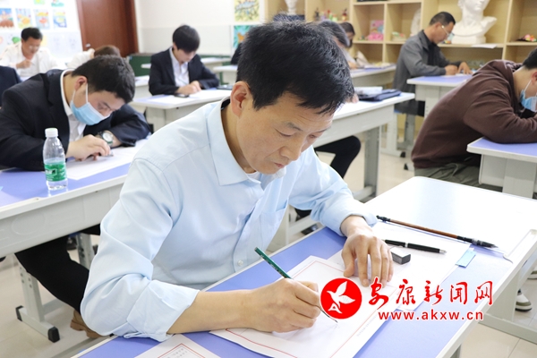 活動中,參賽選手在規定時間內,完成鋼筆字、粉筆字、毛筆字和簡筆畫創作。黨員教師鋼筆字和粉筆字書寫入黨誓詞,進一步錘煉了黨性,重溫了初心,堅定了不忘初心跟黨走的信心。非黨員教師硬筆書寫《清平樂·六盤山》,在感受偉人宏大氣概和紅軍北上抗日堅強意志的同時,激發了大家為黨育人、為國育才的不竭動力。整個比賽過程,選手們潑墨揮毫、激烈角逐,憑借著過硬的專業技能和深厚的文化素養,在短短40分鐘內,將一幅幅規范、簡潔的書畫作品呈現在大家眼前。毛筆字或氣勢磅礴或剛柔并濟;鋼筆字或筆順流暢或秀氣雋美;粉筆字或清新端正或大方得體;簡筆畫或勾勒簡潔或陽光活力,充分展現了安康高新區教師扎實的教學基本功。