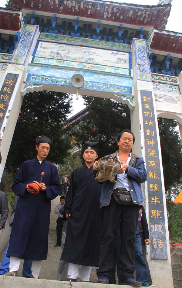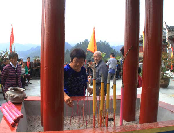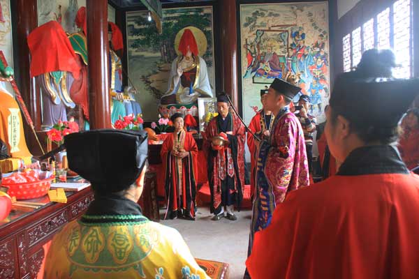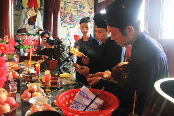 在祖師殿的正殿里,道長(zhǎng)馬世富帶領(lǐng)幾名道士正在進(jìn)行開(kāi)光儀式。據(jù)悉,祖師殿最早建成時(shí)間已無(wú)從考證,但據(jù)碑文記載,清嘉慶十八年重修,文革期間遭嚴(yán)重毀壞。公元2000年經(jīng)多方籌款,重修祖師殿。現(xiàn)分為上下兩殿和鐘樓等建筑宏偉,古色古香,精雕細(xì)琢,巧奪天工。