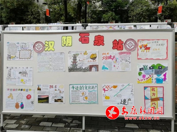 此次展板按地域文化特色,分為漢濱區站、旬陽平利站、漢陰石泉站、鎮坪站、紫嵐寧站五大板塊。每一張手抄報,從設計到排版,從書寫到繪畫,都各具特色:這里面有對壯美河山的贊美,有對雄偉建筑的欽佩,有對安康區縣奇觀異景、民俗文化的自豪……圖文并茂的手抄報吸引了全校師生駐足觀賞,嘖嘖稱贊,更有學生拿著紙筆認真地做記錄。