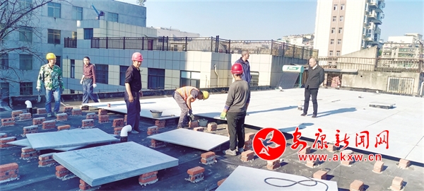 工人正在對(duì)安康日?qǐng)?bào)社家屬樓房頂進(jìn)行處理