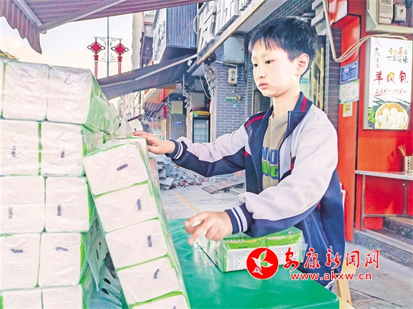 同時,花三還將丁凱家的情況介紹給了身邊的朋友,并把丁凱家的情況和小文杰賣紙巾的事拍成了小視頻,在抖音平臺發布。在花三和其他網友的共同推動下,越來越多的愛心人士聯系上了丁凱,愿意免費為他們提供場所,讓他們擺放餐巾紙自助銷售。