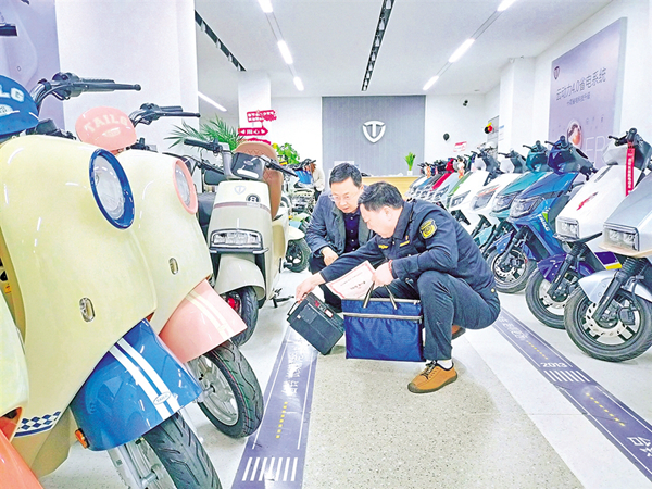 ①執法人員檢查電動自行車配件。席瑾 攝②向電動自行車銷售人員了解情況。席瑾 攝本網訊(通訊員 柯賢會 喬巍)“請出示電動自行車合格證件。”“打開蓋板,看看……
