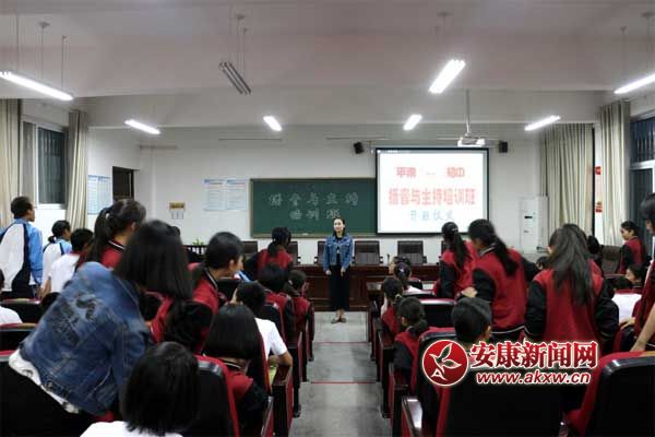 在舉行了簡(jiǎn)短的開班儀式后,學(xué)校聘請(qǐng)的漢陰電視臺(tái)主播楊晶晶進(jìn)行了第一次培訓(xùn)。40多名播音主持愛好者參加了培訓(xùn)。培訓(xùn)中楊老師主要和同學(xué)們分享主持人臺(tái)風(fēng)和態(tài)勢(shì)語(yǔ)等方面的知識(shí)。楊老師惟妙惟肖地對(duì)主持人如何做到走姿站姿大方得體、微笑眼神交流傳神、肢體語(yǔ)言表情達(dá)意等向同學(xué)們進(jìn)行了細(xì)致講解。在理論講解的同時(shí),又與同學(xué)們進(jìn)行了現(xiàn)場(chǎng)互動(dòng)實(shí)踐練習(xí),同學(xué)們個(gè)個(gè)聚精會(huì)神,積極參與互動(dòng)。楊老師幽默風(fēng)趣的授課贏得了陣陣掌聲,同學(xué)們?cè)谳p松愉快的課堂上既學(xué)到了專業(yè)知識(shí),又在實(shí)踐中得到了專業(yè)技巧的點(diǎn)撥。