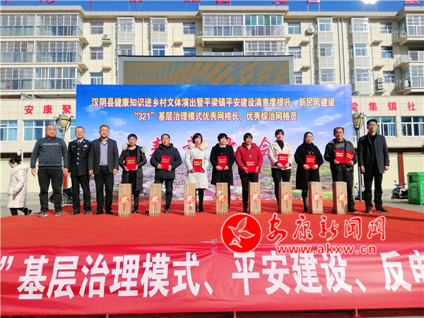 本網訊(通訊員 歐定揚 鄧麗 張成軍)12月2日,漢陰縣舉行衛生健康知識宣講和文藝巡演進鄉村暨平梁鎮321基層治理模式優秀網格長、優秀綜治網格員表彰大會。普及衛生健康知識,全面提升城鄉廣大人民群眾的健康水平WJu安康新聞網