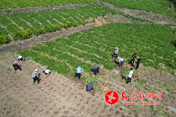 “大家加把勁兒,惠康源公司今天下午要2000斤土豆。”在漢陰縣雙河口鎮黃龍村的土豆種植基地里,駐村第一書記唐建安一邊忙著和村民一起采收土豆,一邊督促進度。十余位村民分工有序,忙而不亂,隨著鋤頭的揮舞,一顆顆外觀飽滿、個頭勻稱的土豆破土而出,分揀、裝袋……田地里每個人的臉上都掛滿了豐收的喜悅。