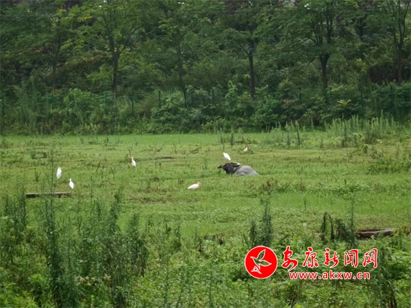 本網訊(通訊員 陳小惠)青青綠草地,牛伏月水畔,鷺鷥三五只,與牛共棲息。日前,在漢陰縣澗池鎮樅嶺村月河之畔,一頭水牛正悠閑地臥在草地上小憩,幾只白鷺時而單腳站立在牛背上,時而俏皮地繞牛飛翔,構成一幅優美的動態畫卷。