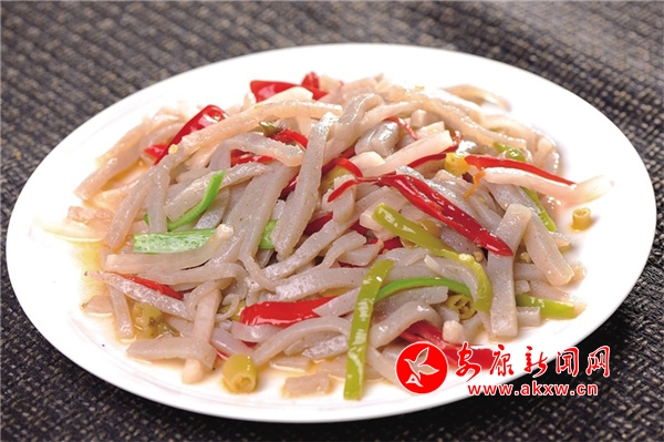 酸辣魔芋:是嵐皋特色名菜,也是當地非遺項目之一。以秋收后鮮魔芋漿汁為原料,加入堿水煮制,冷固后呈豆腐形狀,切塊后與當地泡菜一起大火翻炒而成。魔芋中的“堿”和泡菜中的“酸”完美結合,具有保護腸胃、排毒養顏、減肥瘦身的功效,同時還能降血糖、降血脂、降血壓。嵐皋民諺“要見好公婆,多吃鬼腦殼”,說的是姑娘吃了魔芋豆腐,瘦體健身、容光煥發,能得到公婆的好感。現代醫學認為,魔芋豆腐中含量最大的葡萄甘露聚糖,具有強大的膨脹力,超過任何一種植物膠的黏韌度,既可填充胃腸,消除饑餓感,又因所含熱量微乎其微,故能控制體重、減肥健美。此外,魔芋豆腐既能開胃化食,又能清除腸道垃圾,有防癌抗癌的神奇魔力,享有“防癌魔衣”“神奇食品”的美譽。