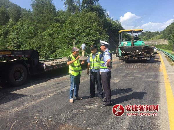 8月9日,寧陜路政中隊聯合安康高交來到K1225+300至K1240+500M路段,實地檢查施工情況。按高速公路大中修養護施工要求,該路段實行單幅雙向通行,路政、交警人員重點對施工路段的施工標志、導向標志、限速標志以及交通標志等是否按照規定擺放;施工區域與通行區域是否進行有效的隔離以及施工機械前后是否設置明顯的警示標志和閃光警示燈等情況進行檢查。通過檢查,路政人員發現單幅雙向分流路段兩處改道口路段存在安全隱患,路面有出現坑槽的情況。對存在安全隱患,路政、交警人員當場找到施工單位要求整改,仔細告知需要增加哪些些標志標牌以及如何設置隔離設施的注意事項。同時路政、交警人員與施工方對施工進度進行了仔細的詢問,并就九寨溝震后救援貨車通行問題進行了協商,重點強調近期施工路段道路暢通的重要性,要求施工單位嚴格按照施工作業要求進行施工,及時消除安全隱患,有效防止事故發生,保障施工現場作業安全與道路暢通。