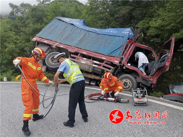 受西漢高速路面養護施工,貨車實施交通管制影響, 210國道貨運車輛激增,交通安全形勢突然嚴峻。7月17日中午13時許,一輛倉柵式輕型貨車滿載一車貨物,由成都沿210國道前往河南,行駛至210國道1392公里+100米處與道路左側山體碰撞,車頭被撞癟,駕駛員下半身被卡在駕駛室無法脫困,生命垂危。副駕駛被甩出車外。接警后廣貨街中隊迅速出警,第一時間趕到現場,迅速組織各救援單位開展施救。隨后,醫護人員、消防官兵、保險業務員先后到達,四家單位有條不紊地聯合救援即刻展開。交通警察對事故路段臨時性實施交通管制,防止發生次生事故。同時配合消防官兵對卡在車內的駕駛人進行施救。醫護人員對傷員進行前期救治,包扎、輸液、輸氧。保險公司派出救援車輛對遺散的貨物進行收集,對受困車輛進行施救。歷時兩個小時,受困人員被救出,送醫院治療。H52安康新聞網