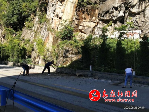 8月25日,寧陜縣210國道白石崖路段發生小面積山體滑坡,掉下的石頭灑落一地,還有不少泥土被沖到道路上,導致車輛通行受阻,村民出行也受到影響。寧陜縣住建局(城管局)4名下鄉干部途徑此處,齊心合力清理路中石塊和泥土。期間,一人疏導車輛、三人徒手清理石塊和泥土,經過近20多分鐘的清理,消除了道路安全隱患,受阻公路恢復正常通行,路過司機紛紛鳴笛表示敬意,受到群眾的一致點贊好評。(王輝/圖文)TkJ安康新聞網