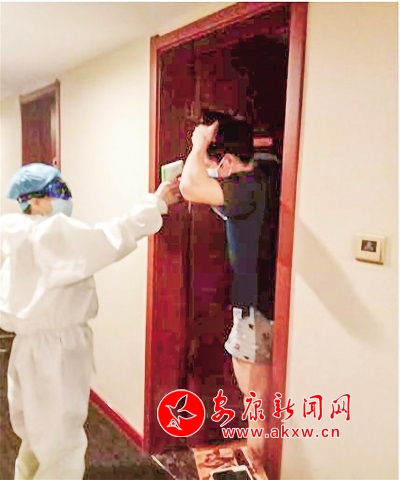 基地工作人員正在對隔離的國家隊隊員測量體溫。