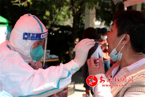 在城北社區幸福花園核酸檢測采樣點,核酸采樣正在井然有序地進行著。醫護人員全副武裝,溫柔輕聲引導,手上動作不停,按照核酸檢測采樣要求,嫻熟地對前來核酸檢測的群眾進行咽拭子采樣。