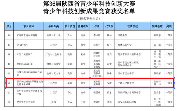 本網訊(通訊員 李小杰)日前,陜西省第36屆青少年科技創新大賽獲獎名單公布,寧陜中學申報的4項科技創新成果全部獲獎,其中:高二(2)班王梓俊、王鈜偉同學的《基于AOA協議的野外通訊與救援求生系統》項目榮獲一等獎,并被推薦參加全國第36屆青少年科技創新大賽,又一次入圍全國大賽。高二(5)班學生王國棟的《拓撲網絡構建與海明校驗的實驗探究》榮獲二等獎、高三(4)班學生段永橘的《全球日期變更演示模型》榮獲三等獎、高三(4)班學生沈子怡的《快速軟化獼猴桃的“妙招”》榮獲優秀獎。獲獎項目涵蓋工程學、計算機科學、地理學和植物學等多學科領域。