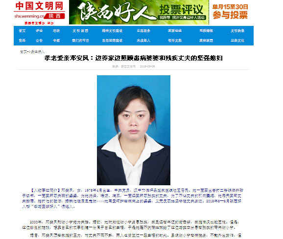 安康新聞網訊(通訊員 龐浩)5月9日,陜西文明網專欄講述了寧陜縣筒車灣鎮七里村外嫁女鄧安鳳的感人事跡,日前,她被評為“中國好人”“全國孝親敬老之星&r……