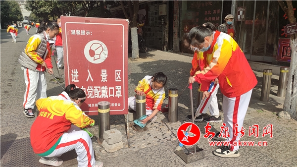 活動中,在老師組織下,該校少先隊員有序來到老街、禹王宮、北門巷等區域。根據活動分工,各班學生手持掃帚、鐵鍬、抹布、垃圾袋等勞動工具分赴各自的義務清掃區。期間,少先隊員們分工明確、團結協作,發揚不怕臟、不怕苦、不怕累的精神,有的少先隊員用抹布擦洗街道兩側的宣傳欄,有的清掃街道上的落葉和白色垃圾,有的集中打包清運垃圾,孩子們忙得不亦樂乎,用自己的實際行動詮釋雷鋒精神的時代內涵,為“三宜石泉”建設貢獻力量。