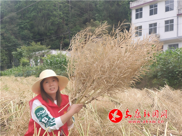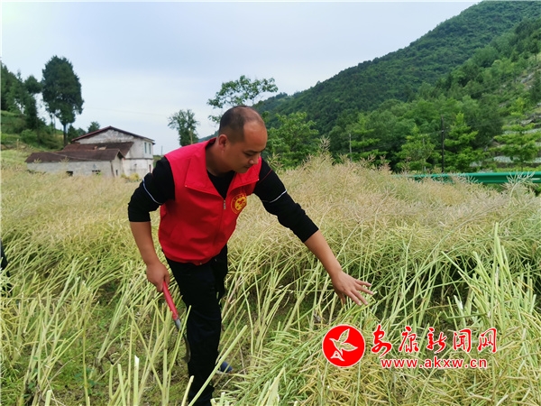 在油菜地里,朱貴武手持鐮刀,向參加勞動(dòng)的同志講解,“握刀柄的力度要恰當(dāng),松了刀會(huì)脫手,緊了可能把自己給傷了,同時(shí)要注意腳底下的茬子,不要摔倒了,干農(nóng)戶沒(méi)多大的技巧,要自己去熟悉掌握,要多看下種地老前輩是怎么做的”。